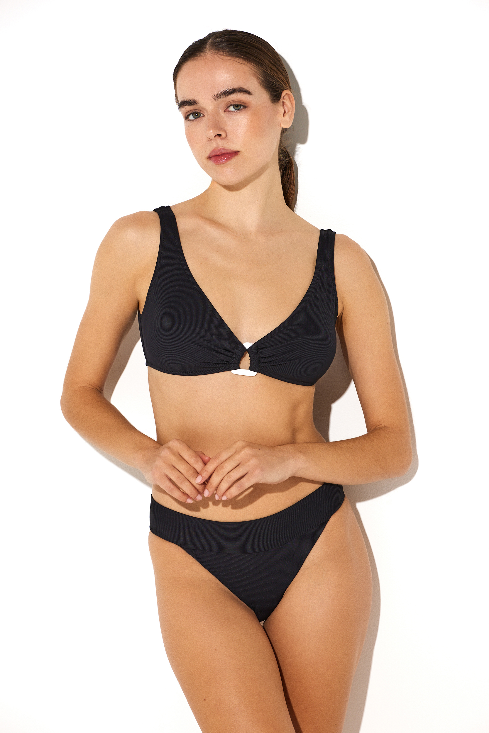 Μπικίνι με top που δένει στην πλάτη και διακοσμητικό και slip με αναβατήρες που αυξομειώνει στο πλάι στο επιθυμητό μέγεθος.